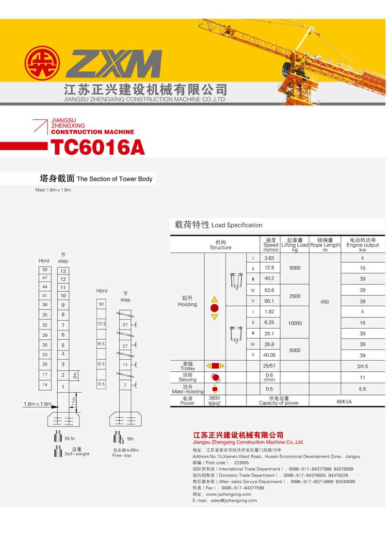 2、最大工作幅度60米,最大起重量8噸,末端最大起重量1.6噸,額定起重力矩1250KN.M;