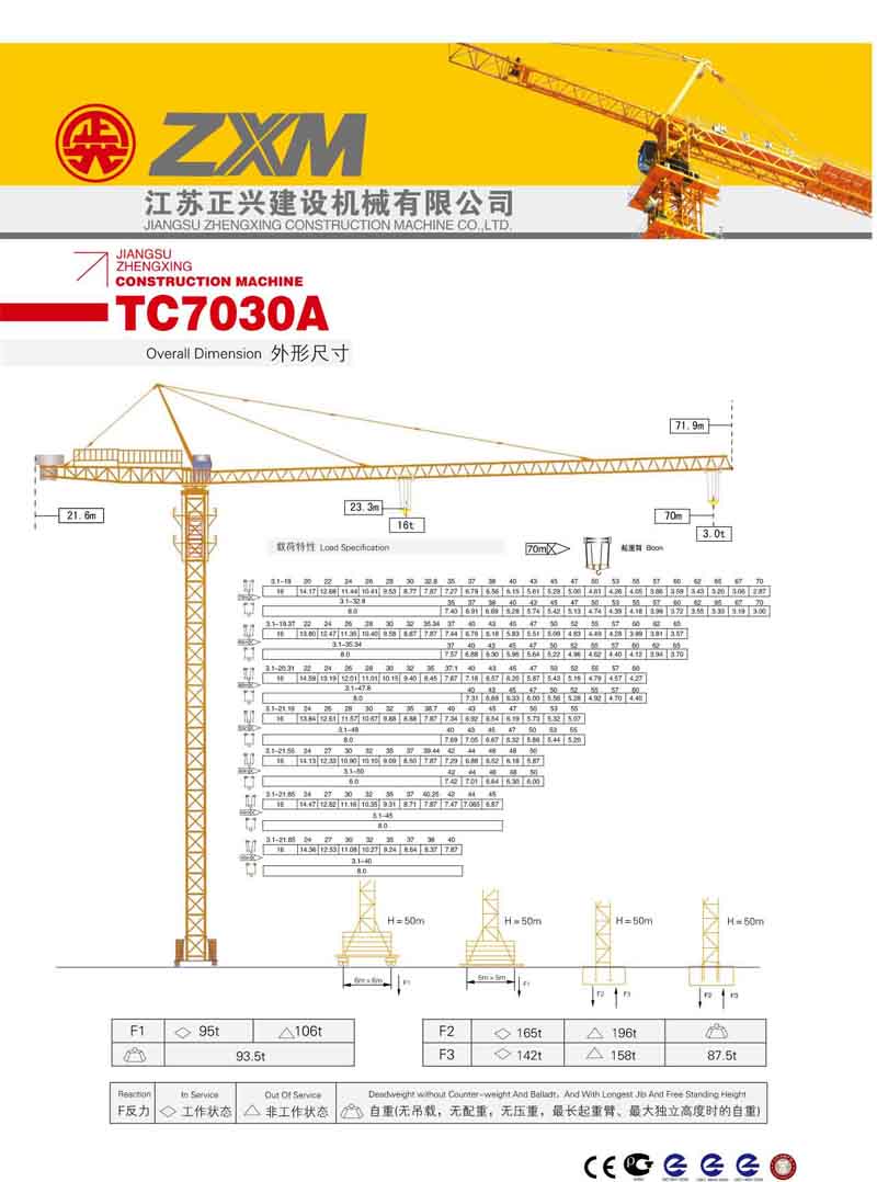 2、最大工作幅70米,最大起重量16噸,末端最大起重量3.0噸,額定起重力矩2500KN.M;