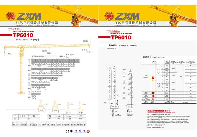 2、最大工作幅度60米,最大起重量6噸,額定起重力矩800KN.M;