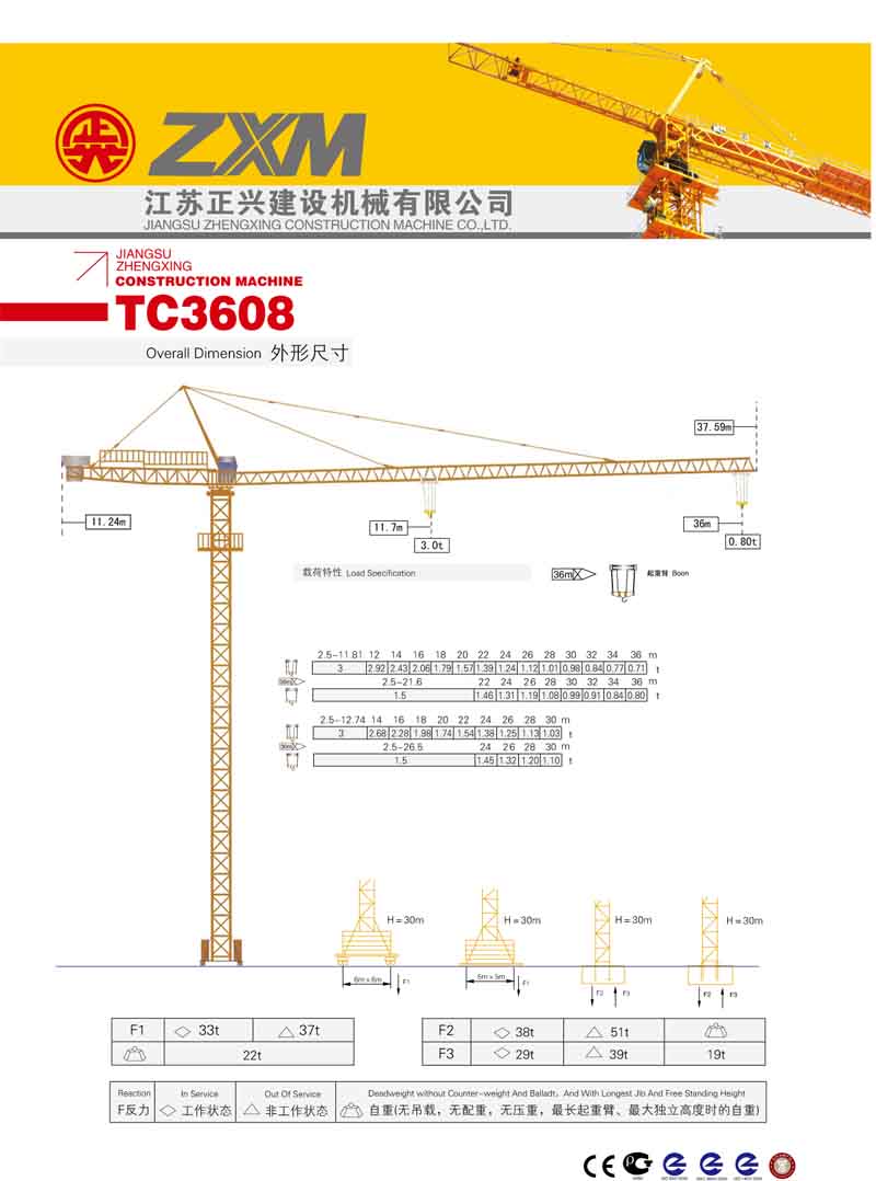 2、最大工作幅度36米,最大起重量3噸,額定起重力矩300KN.M;